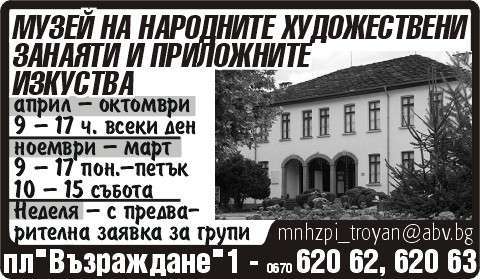 МУЗЕЙ НА НАРОДНИТЕ ХУДОЖЕСТВЕНИ ЗАНАЯТИ И ПРИЛОЖНИТЕ ИЗКУСТВА, април – октомври 9 – 17 ч. всеки ден, ноември – март 9 – 17 пон.–петък, 10 – 15 събота, Неделя – с предварителна заявка за групи