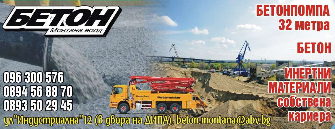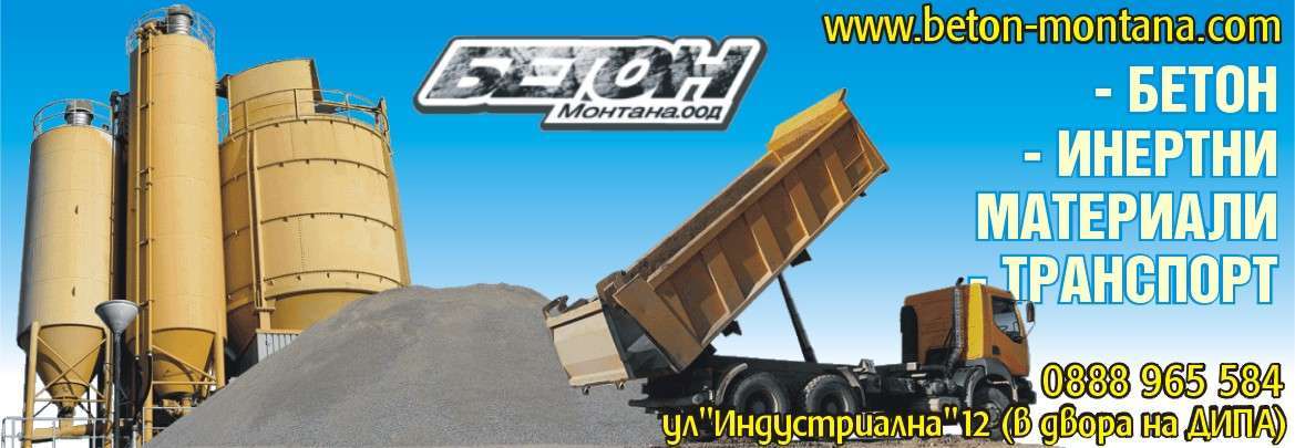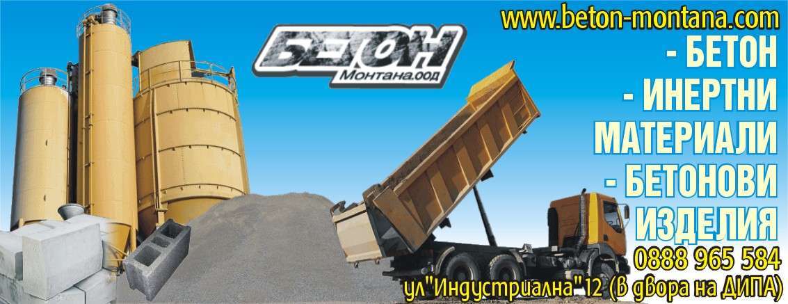 „Бетон Монтана" ЕООД - Вашето удовлетворение е нашияT бизнес! Производство на бетонни смеси, инертни материали от собствена кариера, строителство и услуги със строителна техника. Фирмата разполага с бетон помпи до 28м, бетоновози с обем до 9м3, и товарни автомобили IVECO TRAKKER със самосвална надстройка Square “Meiller”. Инертни материали