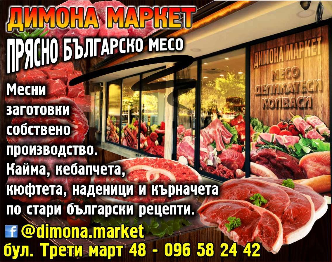 ДИМОНА МАРКЕТ. Прясно българско месо. Месни заготовки собствено производство. Кайма, кебапчета, кюфтета, наденици и кърначета по стари български рецепти.