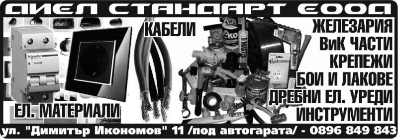 | Описание: | ЕЛ. МАТЕРИАЛИ, КАБЕЛИ, ЖЕЛЕЗАРИЯ ВиК ЧАСТИ КРЕПЕЖИ БОИ И ЛАКОВЕ ДРЕБНИ ЕЛ. УРЕДИ ИНСТРУМЕНТИ |