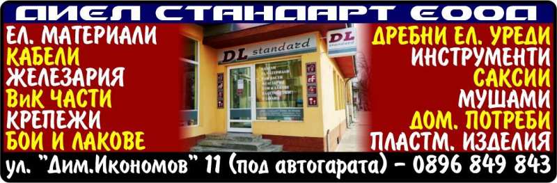 | Описание: | Диел Стандарт ЕООД. ЕЛ. МАТЕРИАЛИ КАБЕЛИ ЖЕЛЕЗАРИЯ ВиК ЧАСТИ КРЕПЕЖИ БОИ И ЛАКОВЕ. ДРЕБНИ ЕЛ. УРЕДИ ИНСТРУМЕНТИ САКСИИ МУШАМИ ДОМ. ПОТРЕБИ ПЛАСТМ. ИЗДЕЛИЯ |