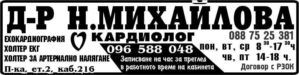 Д-р Н.МИХАЙЛОВА КАРДИОЛОГ. Ехокардиография Холтер ЕКГ Холтер за артериално налягане. Договор с РЗОК. пон,вт,ср - 9:30-17:30ч.; чв,пт - 14-18 ч. Записване на час за преглед в работното време на кабинета