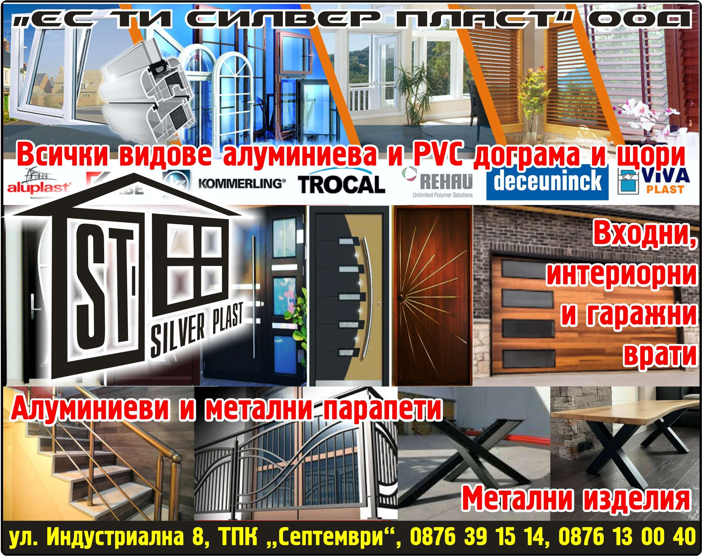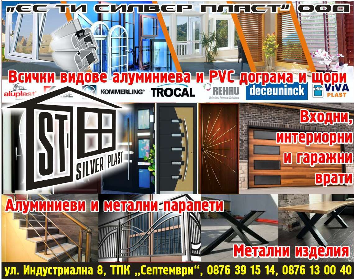Всички видове алуминиева и PVC дограма и щори. Входни, интериорни и гаражни врати. Алуминиеви и метални парапети. Метални изделия