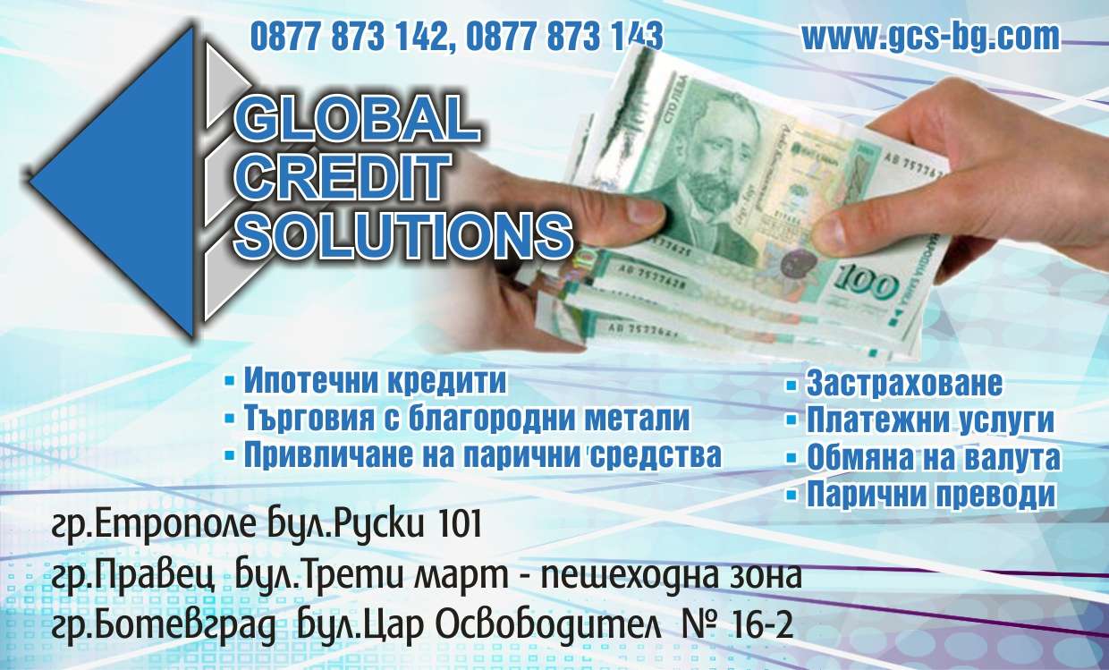GLOBAL CREDIT SOLUTIONS. Ипотечни кредити. Търговия с благородни метали. Привличане на парични средства. Застраховане. Платежни услуги. Обмяна на валута. Парични преводи.