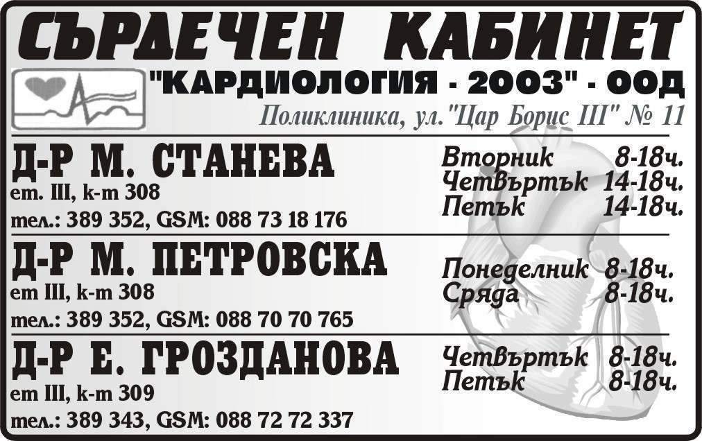 СЪРДЕЧЕН КАБИНЕТ. Д-р М. Станева. Сряда 8-18ч. Четвъртък 8-18ч. Петък 8-13ч.. Д-р М. Петровска Понеделник 8-18ч. Вторник 8-18ч.. Д-р Е. Грозданова. Сряда 8-18ч. Четвъртък 8-18ч. Петък 8-13ч.