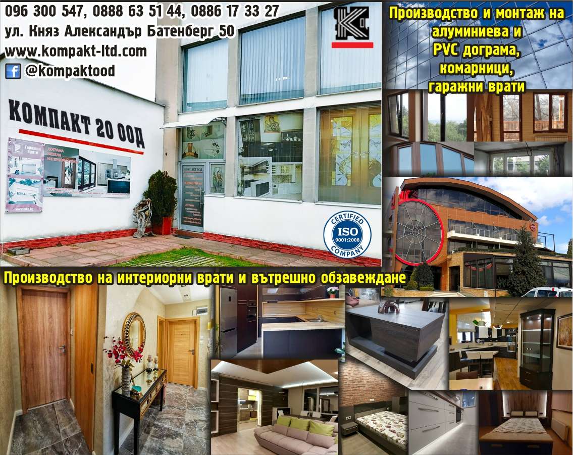 Производство и монтаж на алуминиева и PVC дограма, комарници, гаражни врати. Производство на интериорни врати и вътрешно обзавеждане