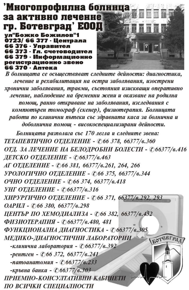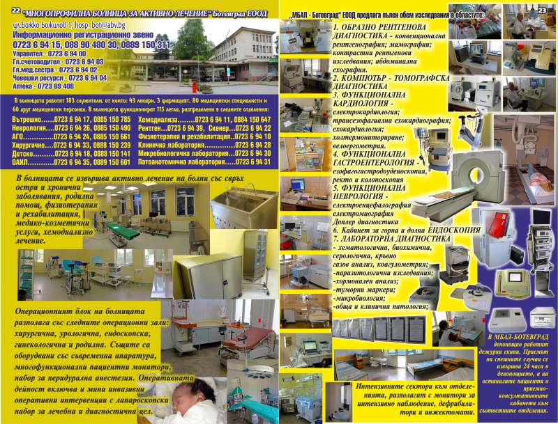 | Описание: | “МНОГОПРОФИЛНА БОЛНИЦА ЗА АКТИВНО ЛЕЧЕНИЕ“ Ботевград ЕООД. Информационно регистрационно звено 072369415, 0889048030, 0889150311 Управител - 072369400 Гл.счетоводител - 072369403 Гл.мед.сестра - 072369402 Човешки ресурси - 072369404 Аптека - 072369408. В болницата работят 183 служители, от които: 43 лекари, 3 фармацевт, 80 медицински специалисти и 60 друг медицински персонал. В болницата функционират 115 легла, разпределени в следните отделения: Вътрешно......072369417, 0885150785 Неврология....072369426, 0885150490 АГО..............072369424, 0885150661 Хирургично....072369433, 0888150239 Детско..........072369418, 0888150141 ОАИЛ............072369435, 0889150601. Хемодиализа........072369411, 0884150647 Рентген...072369439, Скенер...072369422 Физиотерапия и рехабилитация..072369410 Клинична лаборатория..............072369428 Микробиологична лаборатория...072369430 Патоанатомична лаборатория.....072369431. В болницата се извършва активно лечение на болни със свръх остри и хронични заболявания, родилна помощ, физиотерапия и рехабилитация, медико-козметични услуги, хемодиализно лечение. Операционният блок на болницата разполага със следните операционни зали: хирургична, урологична, ендоскопска, гинекологична и родилна. Същите са оборудвани със съвременна апаратура, многофункционални пациентни монитори, набор за перидурална анестезия. Оперативната дейност включва и мини инвазивни оперативни интервенции с лапароскопски набор за лечебна и диагностична цел. „МБАЛ - Ботевград" ЕООД предлага пълен обем изследвания в областите: 1. ОБРАЗНО РЕНТГЕНОВА ДИАГНОСТИКА - конвенционална рентгенография; мамографии; контрастни рентгенови изследвания; абдоминална ехография. 2. КОМПЮТЬР - ТОМОГРАФСКА ДИАГНОСТИКА 3. ФУНКЦИОНАЛНА КАРДИОЛОГИЯ - електрокардиология; трансезофагиална ехокардиография; ехокардиология; холтермониториране; велоергометрия. 4. ФУНКЦИОНАЛНА ГАСТРОЕНТЕРОЛОГИЯ - езофагогастродоуденоскопия, ректо и колоноскопия 5. ФУНКЦИОНАЛНА НЕВРОЛОГИЯ - електроенцефалография електромиография Доплер диагностика 6. Кабинет за горна и долна ЕНДОСКОПИЯ 7. ЛАБОРАТОРНА ДИАГНОСТИКА - хематологична, биохимична, серологична, кръвно газов анализ, коагулометрия; -паразитологични изследвания; -хормонален анализ; -туморни маркери; -микробиология; -обща и клинична патология; Интензивните сектори към отделе- нията, разполагат с монитори за интензивно наблюдение, дефрибила- тори и инжектомати. В „МБАЛ-БОТЕВГРАД денонощно работят дежурни екипи. Приемът на спешните случаи се извършва 24 часа в денонощието, а на останалите пациенти в приемно- консултативните кабинети към съответните отделения. |