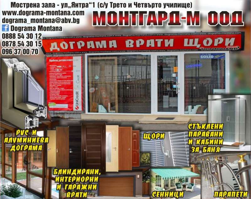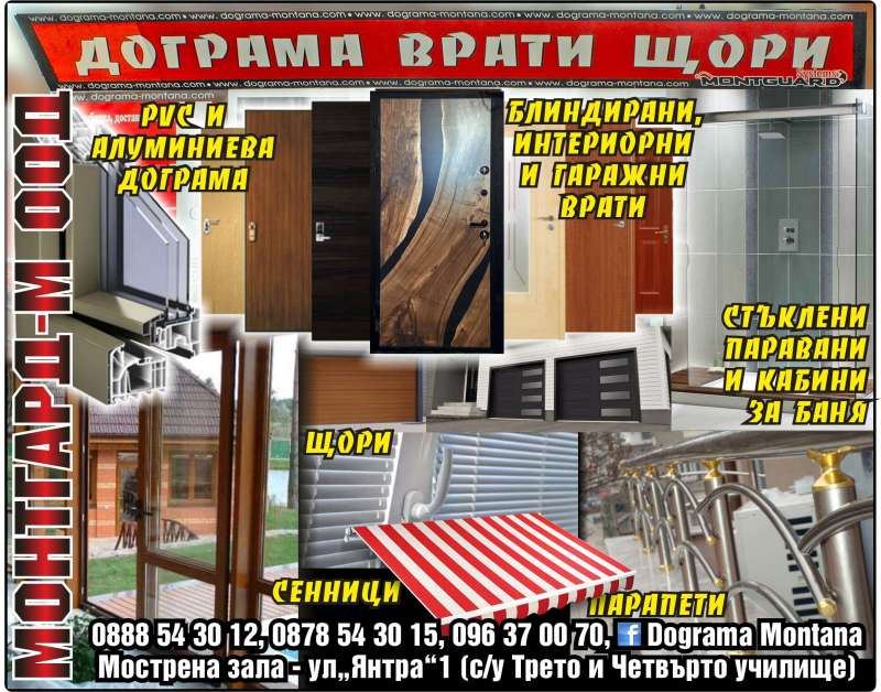 | Описание: | PVC и алуминиева ДОГРАМА. Блиндирани, интериорни и гаражни ВРАТИ. ЩОРИ. Стъклени паравани и кабини за баня. СЕННИЦИ. ПАРАПЕТИ |