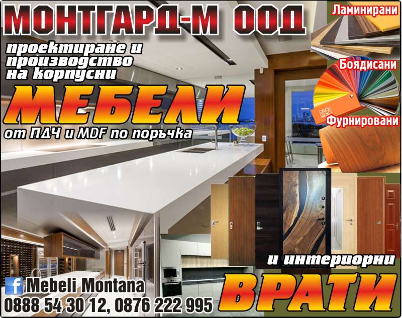 | Описание: | проектиране и производство на корпусни МЕБЕЛИ и интериорни ВРАТИ от ПДЧ и MDF по поръчка. ПОКРИТИЯ - Фурнир (дърво), Боя, Ламинат. |