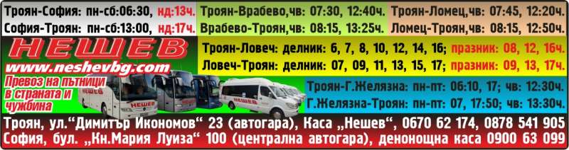 Описание: | Нешев. Превоз на пътници, в страната и, чужбина Троян-София: пн-сб:06:30, нд:13ч. София-Троян: пн-сб:13:00, нд:17ч. Троян-Ловеч: делник: 6, 7, 8, 10, 12, 14, 16; празник: 08, 12, 16ч. Ловеч-Троян: делник: 07, 09, 11, 13, 15, 17; празник: 09, 13, 17ч. Троян-Врабево,чв: 07:30, 12:40ч. Врабево-Троян,чв: 08:15, 13:25ч. Троян-Ломец,чв: 07:45, 12:20ч. Ломец-Троян,чв: 08:15, 12:50ч. Троян-Г.Желязна: пн-пт: 06:10, 17; чв: 12:30ч. Г.Желязна-Троян: пн-пт: 07, 17:50; чв: 13:30ч. |