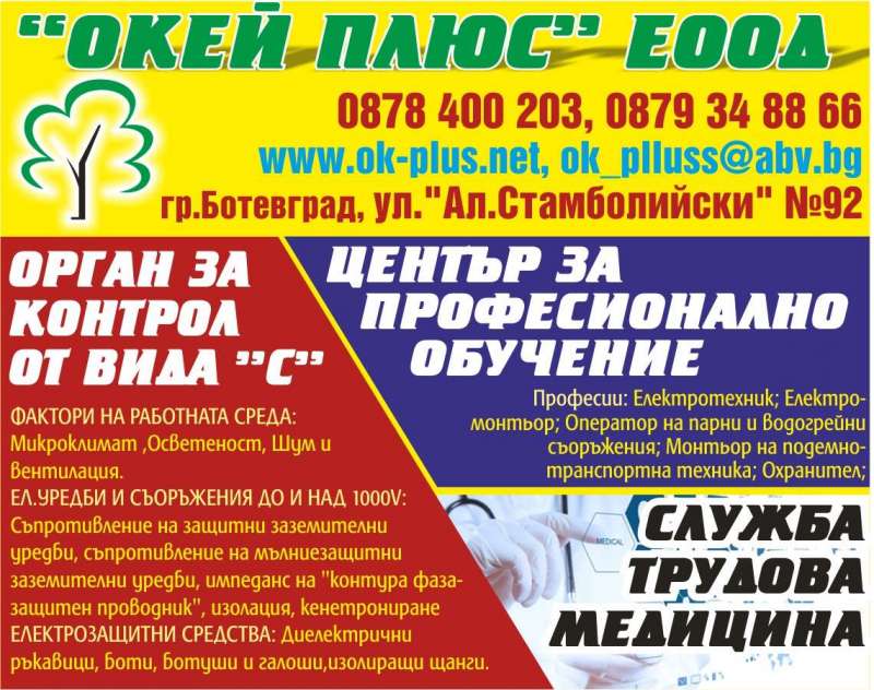 | Описание: | “ОКЕЙ ПЛЮС” ЕООД. ОРГАН ЗА КОНТРОЛ ОТ ВИДА "С". ФАКТОРИ НА РАБОТНАТА СРЕДА: Микроклимат, Осветеност, Шум и вентилация. ЕЛ.УРЕДБИ И СЪОРЪЖЕНИЯ ДО И НАД 1000V: Съпротивление на защитни заземителни уредби, съпротивление на мълниезащитни заземителни уредби, импеданс на "контура фаза- защитен проводник", изолация, кенетрониране ЕЛЕКТРОЗАЩИТНИ СРЕДСТВА: Диелектрични ръкавици, боти, ботуши и галоши,изолиращи щанги. ЦЕНТЪР ЗА ПРОФЕСИОНАЛНО ОБУЧЕНИЕ. Професии: Електротехник; Електро- монтьор; Оператор на парни и водогрейни съоръжения; Монтьор на подемно- транспортна техника; Охранител; СЛУЖБА ТРУДОВА МЕДИЦИНА |