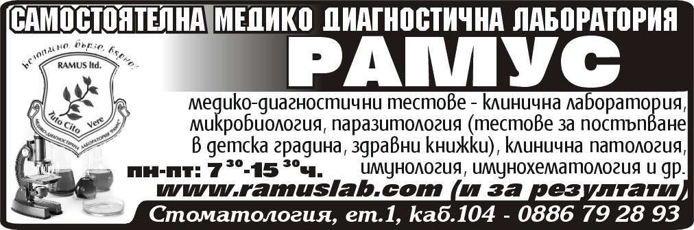 САМОСТОЯТЕЛНА МЕДИКО-ДИАГНОСТИЧНА ЛАБОРАТОРИЯ РАМУС . Съвременно оборудвана лаборатория, в която се използва модерна апаратура и консумативи с най-високо качество. Гаранция, за което дава участието на медико диагностична лаборатория “РАМУС” във всички национални системи за външен контрол, както и в редица международни такива и винаги получава отлична оценка върху всички контролирани параметри. КЛИНИЧНА ЛАБОРАТОРИЯ хормони, туморни маркери МИКРОБИОЛОГИЯ 3gpaвнu кнuжкu, gemcku градини, домашни посещения ПАРАЗИТОЛОГИЯ ВИРУСОЛОГИЯ И ИМУНОХЕМАТОЛОГИЯ кръвни групи ПАТОЛОГИЯ биопсия, цитонамaзки TECTOBE 3A СОVID19 КОРОНАВИРУС PCR-Tecm SARS COV 2 IgM/IgG бърз тест за откриване на антиген -PANBIO COVID-19 Ag антитела В кръвта - ABBOTT SARS COV 2 IgM антитела в кръвта -ABBOTT SARS COV 2 IgG. Всичко по НЗОК. Online резултати на www.ramuslab.com. пон-пет: 7:30-15:00, събота: 8:00-13:00