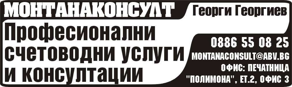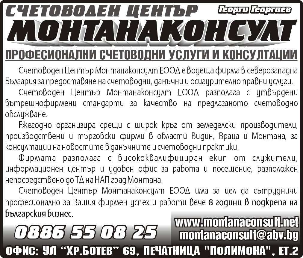 МОНТАНАКОНСУЛТ. Георги Георгиев. ПРОФЕСИОНАЛНИ СЧЕТОВОДНИ УСЛУГИ И КОНСУЛТАЦИИ. В Счетоводен Център Монтанаконсулт ЕООД работи доказан екип от специалисти, притежаващи изключително високи професионални умения в сферата на счетоводството, данъчното облагане и социалното осигуряване. Наши клиенти са едни от най-успешните земеделски производители, търговци и предприемачи на територията на област Монтана, Враца и Видин. Ние предоставяме PRO BONO съгласуване/реализиране на Вашите инвестиционни и бизнес намерения, защитаваме интересите Ви пред НАП, доставчици и клиенти и сме на Ваше разположение 365/7/24. Ние работим 14 години в подкрепа на Българския бизнес.