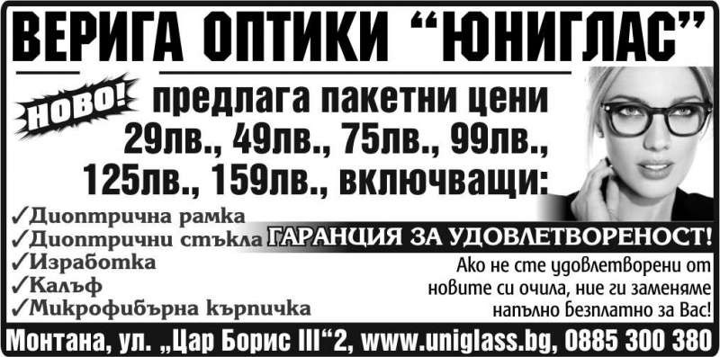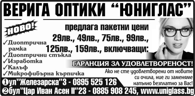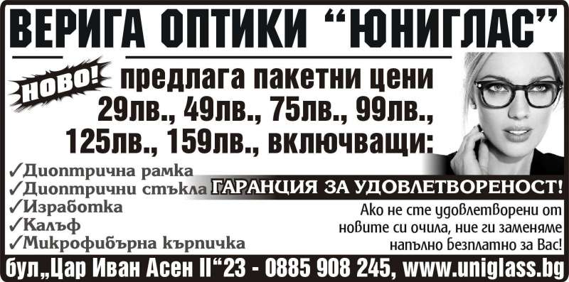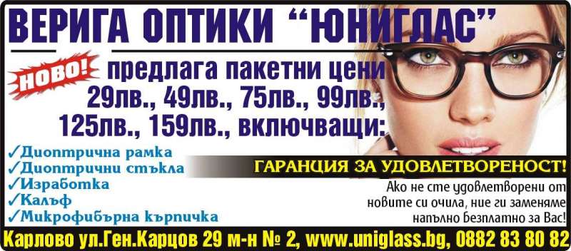 | Описание: | Верига оптики “Юниглас”. предлага пакетни цени 29лв., 49лв., 75лв., 99лв., 125лв., 159лв., включващи: -Диоптрична рамка -Диоптрични стъкла -Изработка -Калъф -Микрофибърна кърпичка. ГАРАНЦИЯ ЗА УДОВЛЕТВОРЕНОСТ!. Ако не сте удовлетворени от новите си очила, ние ги заменяме напълно безплатно за Вас! |
