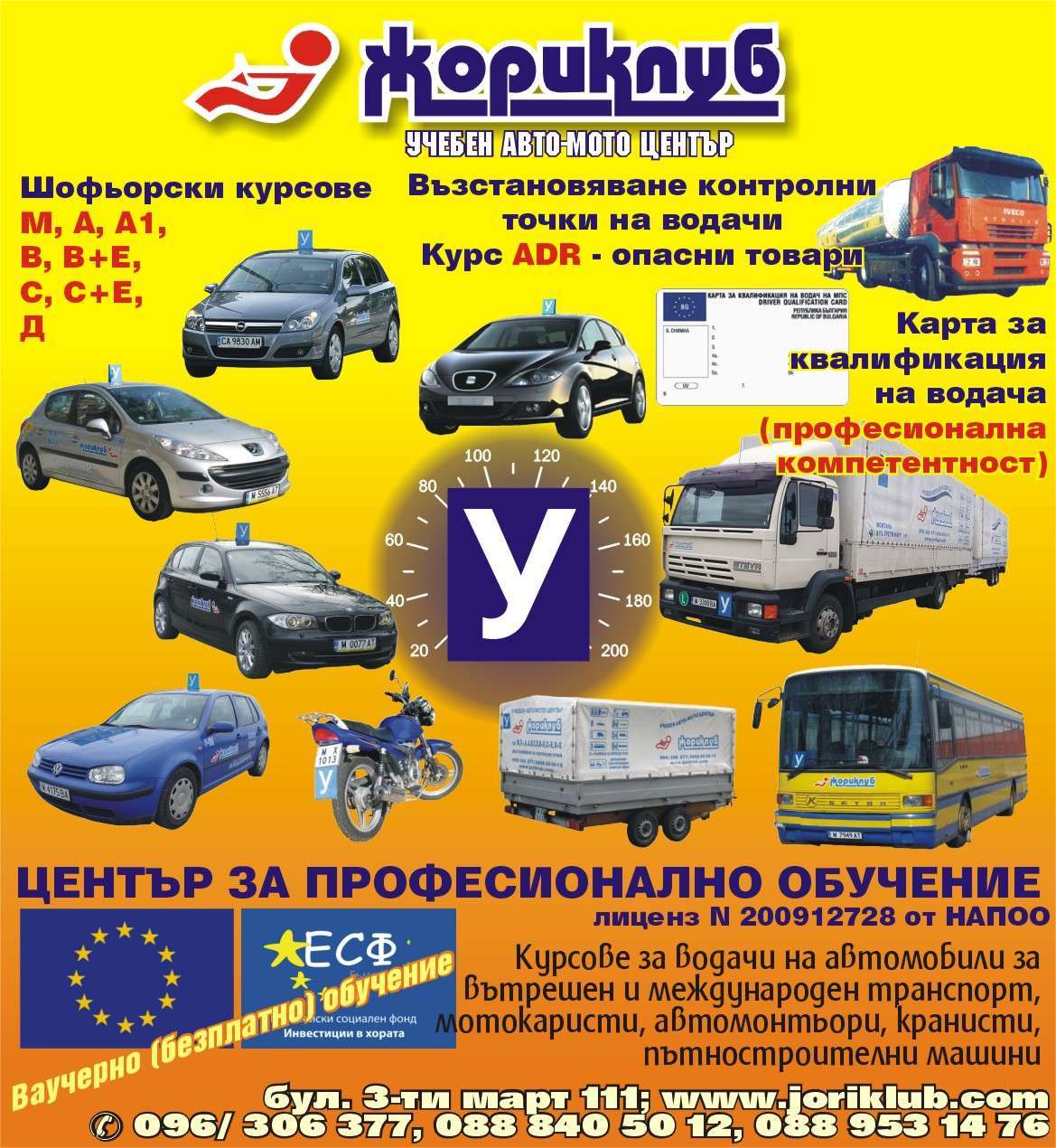 ЖОРИКЛУБ. ВЪЗСТАНОВЯВАНЕ КОНТРОЛНИ ТОЧКИ. Професионална компетентност за превоз на товари и пътници. ЛАБОРАТОРИЯ за психологически изследвания на: - водачи на МПС кат.C и D - превоз на пътници и товари (за работа) - таксиметрови шофьори - нарушители. Единствения в страната покрит полигон!!! ЦЕНТЪР ЗА ПРОФЕСИОНАЛНО ОБУЧЕНИЕ лиценз N 200912728 от НАПОО Курсове за мотокаристи, автомонтьори, кранисти, пътностроителни машини. Обучение с ваучери от Бюрото по труда.